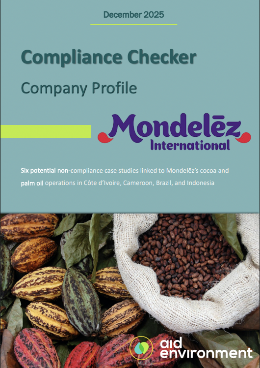 A new Compliance Checker analysis by AidEnvironment uncovers forest loss potentially linked to Mondelēz International’s cocoa and palm oil supply chains, revealing a deep disconnect between the company’s sustainability claims and its actual sourcing practices. While Mondelēz has for years marketed itself as a leader in responsible cocoa and palm oil, the findings gathered in the report demonstrate that forest clearance potentially linked to its supply chains is ongoing, raising serious questions about accountability, traceability, and transparency.
